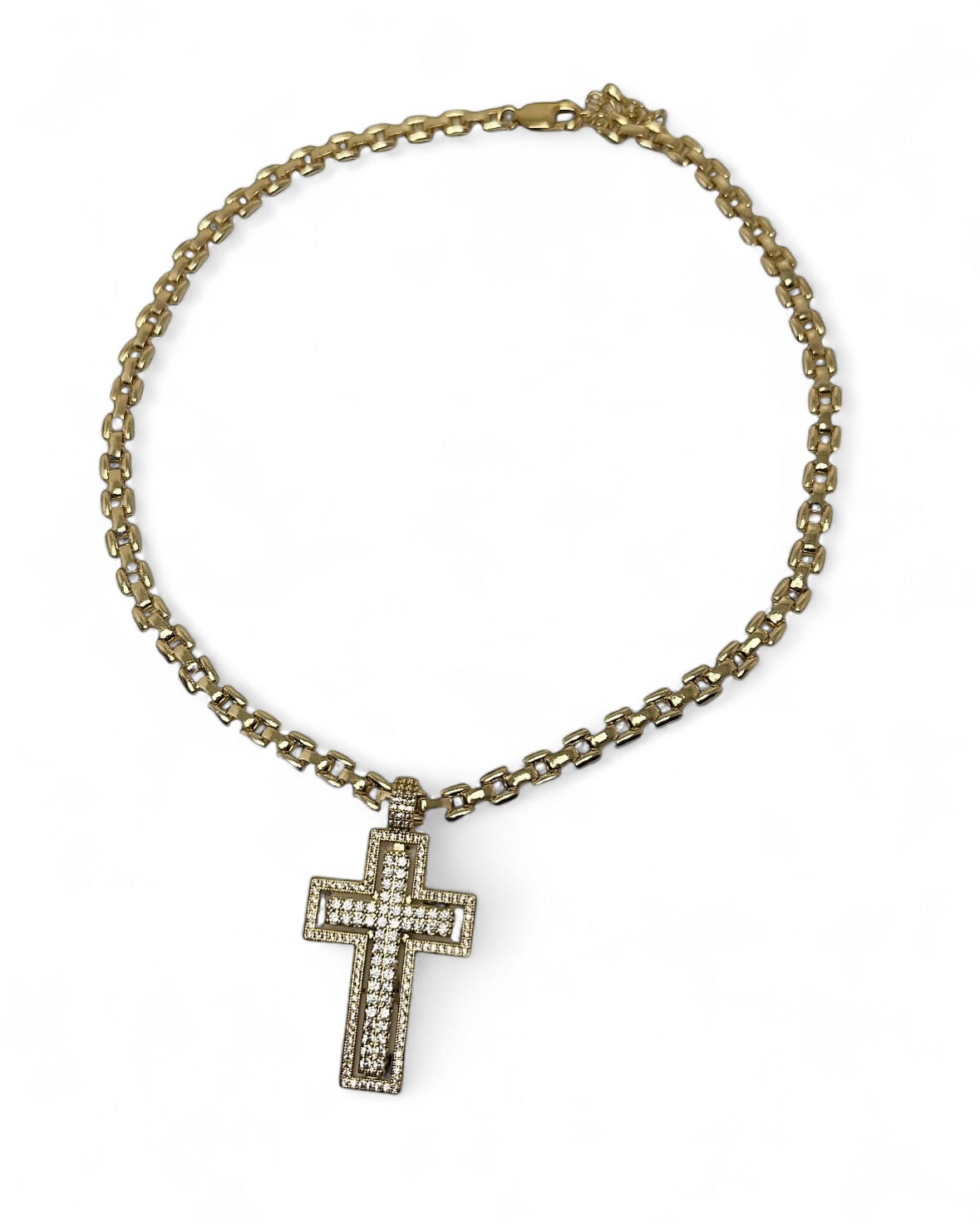 - Bold, powerful, and timeless- the Cross Choker is designed for those who love statement jewelry with a meaning. Featuring a thick gold filled chain and CZ cross pendant, this piece blends classic faith symbolism with modern streetwear edge. Perfect for layering or wearing solo, it's a must have for elevated street style or a luxury inspired aesthetic.