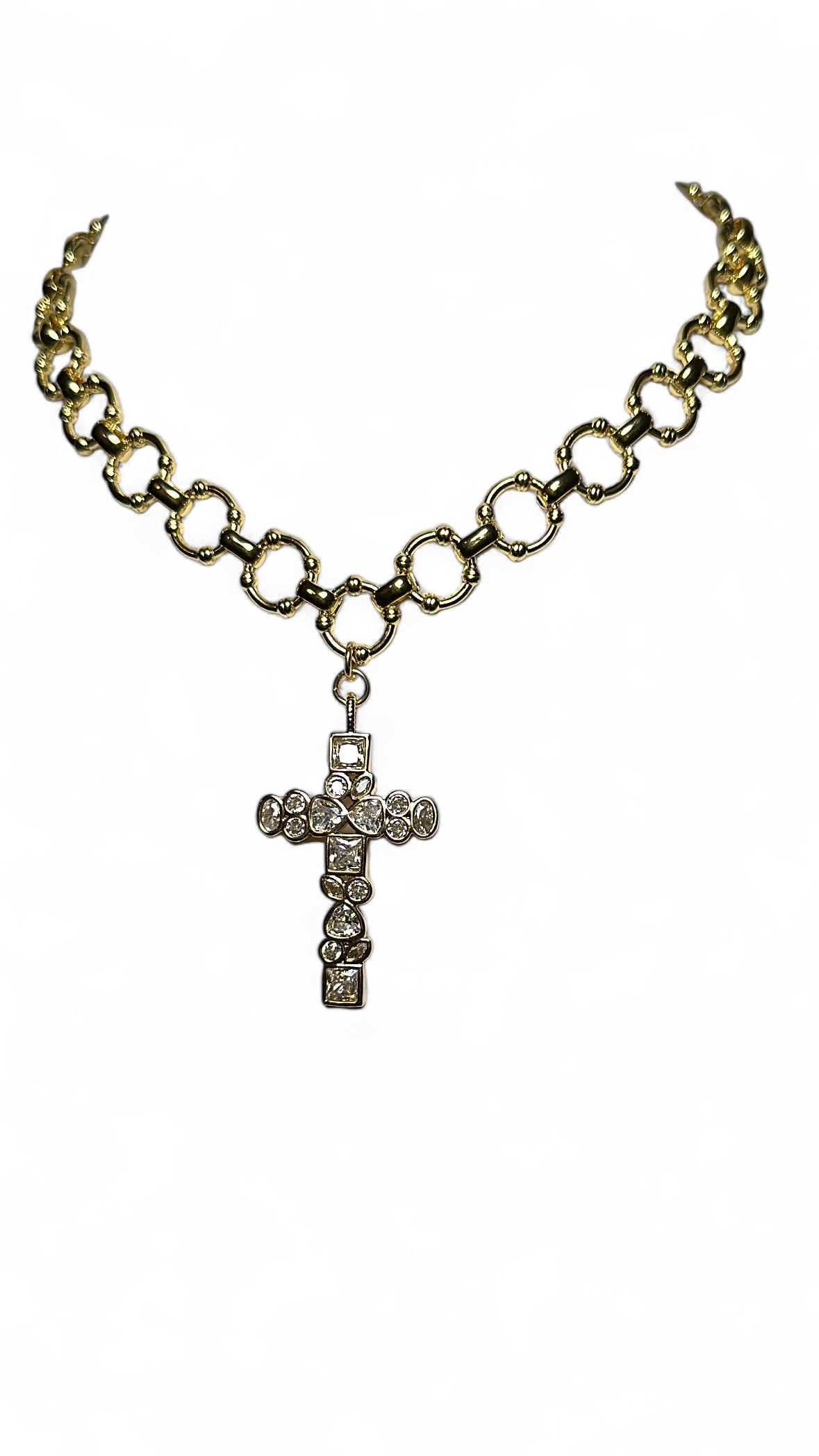 - A symbol of faith, strength and high fashion, the Trinity Choker is a bold yet elegant statement piece. Designed with chunky gold chain links and a crystal studded cross pendant, this choker effortlessly blends edgy street style with luxurious sophistication.